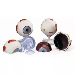 Zerlegbar in: * Obere Hälfte der Lederhaut (sclera) mit Augenmuskelansätzen * Obere Hälfte der Aderhaut mit Netzhaut und Iris * Hornhaut * Linse * Glaskörper Auf Sockel.