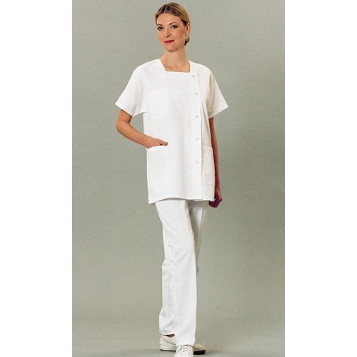 Damenkasack Weiß Tilda Mulliez - Ohne Kragen - Viereckiger Ausschnitt - Seitliche Druckknopfleiste - Kurze gesäumte Kimono-Ärmel - 3 aufgesetzte Taschen - Länge 75 cm - Polyester 65 % Baumwolle 35 %