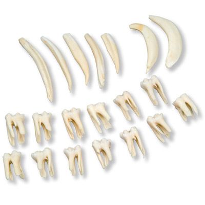 Diese Serie zeigt die unterschiedlichen Zahntypen von Rindern (Wiederkäuer), Schweinen, Hunden, Katzen (Landraubtiere), Kaninchen, Ratten (Nagetiere).1. Schwein: Schneidezähne2. Schwein: Eckzähne3. Schwein: Mahlzähne4. Kuh: Schneidezähne5. Kuh: Mahlzähne6. Hase: Schneidezähne7. Ratte: Schneidezähne8. Hase: Mahlzähne9. Ratte: Mahlzähne10. Katze: ...