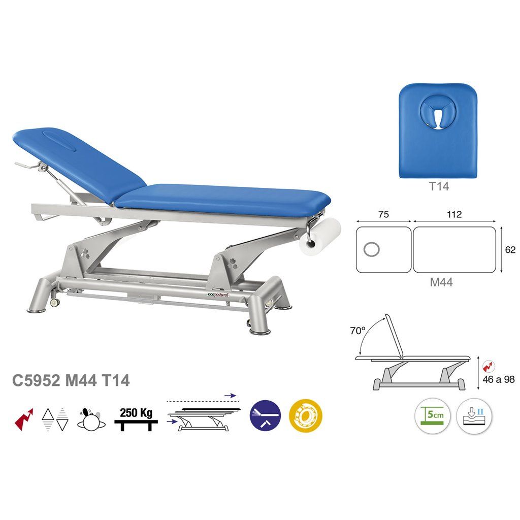 - Table 2 plans (2 sections) - Dimensions Standard : 62x188 cm (M44) - Dimensions optionnels : 70x188 cm (M64) - Variation de la hauteur : 46-98 cm -.Structure fabriquée en tube d’acier laqué avec peinture époxy cuite au four à 250º - Pieds de 90mm de diamètre avec vis de compensation de sol antidérapantes. - Roulettes escamotables actionnement par pédale. Ces roulettes sont uniquement pour le déplacement à vide (nettoyage etc.); elles ne sont pas faites pour le transport des patients. - Système de réglage de hauteur par système périphérique avec moteur Tipe F. - Réglage des plateaux - Dossier avec cavité visage et bouchon inclus en modèle C5952 - Dossier avec cavité visage confort et bouchon rond inclus en modèle C5952TPR - Porte-rouleau chromé inclus. - Sellerie standard: mousse de polyuréthane de 5 cm d´épaisseur et soutien II-Equilibré - Simili cuir ignifuge de catégorie M2, conforme aux normes CE, et disponible en plusieurs coloris. - Protection antimicrobienne et antibactérienne Sanitized®. Composition: PVC 87,5 % - Coton 12,5 % . Epaisseur moyenne: 1,10 mm - Poids table : 92 kg approx. - Poids maximum supporté 200Kg . PRODUIT CE
