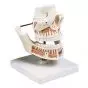 Ober- und Unterkiefer sind zur Detailansicht von Zahnwurzeln, Spongiosa, Gefäßen und Nerven eröffnet. Zur Demonstration der Kaubewegung ist der Unterkiefer beweglich montiert. Auf Sockel.