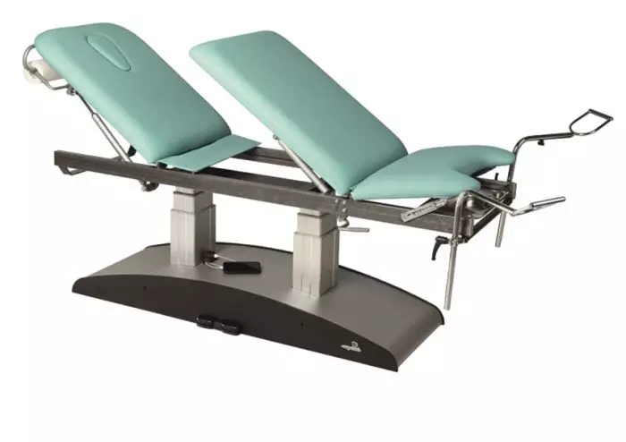 Diese elektrische Liege mit drei Ebenen bietet ein hohes Maß an Flexibilität, da sie je nach den Anforderungen der durchzuführenden Untersuchung in verschiedene Positionen eingestellt werden kann. Die verschiedenen Teile der Sitzfläche können in eine horizontale Position gebracht werden, während die Rückenlehne mit einer Gesichtsmulde hochgeklappt werden kann, um eine "klassische" Couch-Konfiguration zu bilden. Alternativ kann die mittlere Ebene hochgeklappt werden, um eine Rückenlehne zu bilden, wodurch der Tisch in einen Gynäkologiestuhl verwandelt wird.