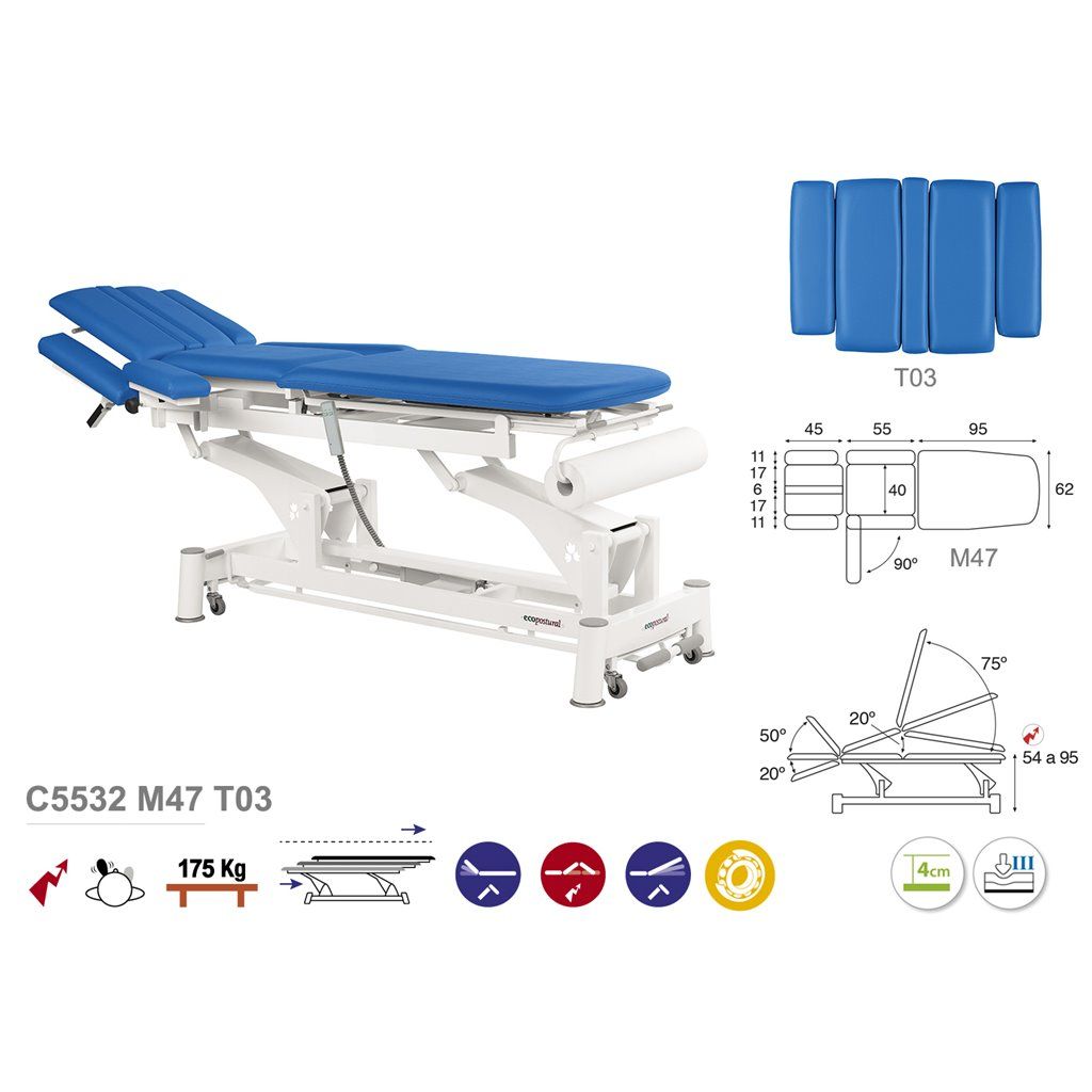 La Table de massage électrique Ecopostural C5532 en 3 plans avec système de réglage de la hauteur par système périphérique avec moteur. Sa structure fabriquée en tube d’acier laqué avec peinture époxy cuite au four à 250º est équipée d'une pièce d’enjolivement frontal avec pieds arrondis fabriqués en polipropylène haute résistance et d'une pièce d'enjolivement latéral.