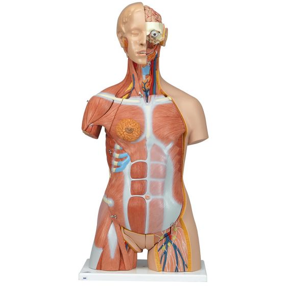 Mit diesem einzigartigen Zweigeschlechtlichen Luxus-Muskel-Torso, 31-teilig B40 sind Sie anatomisch unschlagbar. Er zeigt sowohl die oberflächliche als auch die tiefe Muskulatur und die beiden Hauptmuskeln M. deltoideus und M. gluteus maximus sind zur Detailansicht sogar abnehmbar. Betrachten Sie auch die Wirbel, das Rückenmark, die Spinalnerven und die Vertebralarterien, tauschen Sie die männlichen und weiblichen Genitaleinsätze gegeneinander aus, entdecken Sie die inneren Strukturen des Gehirns und, und, und...